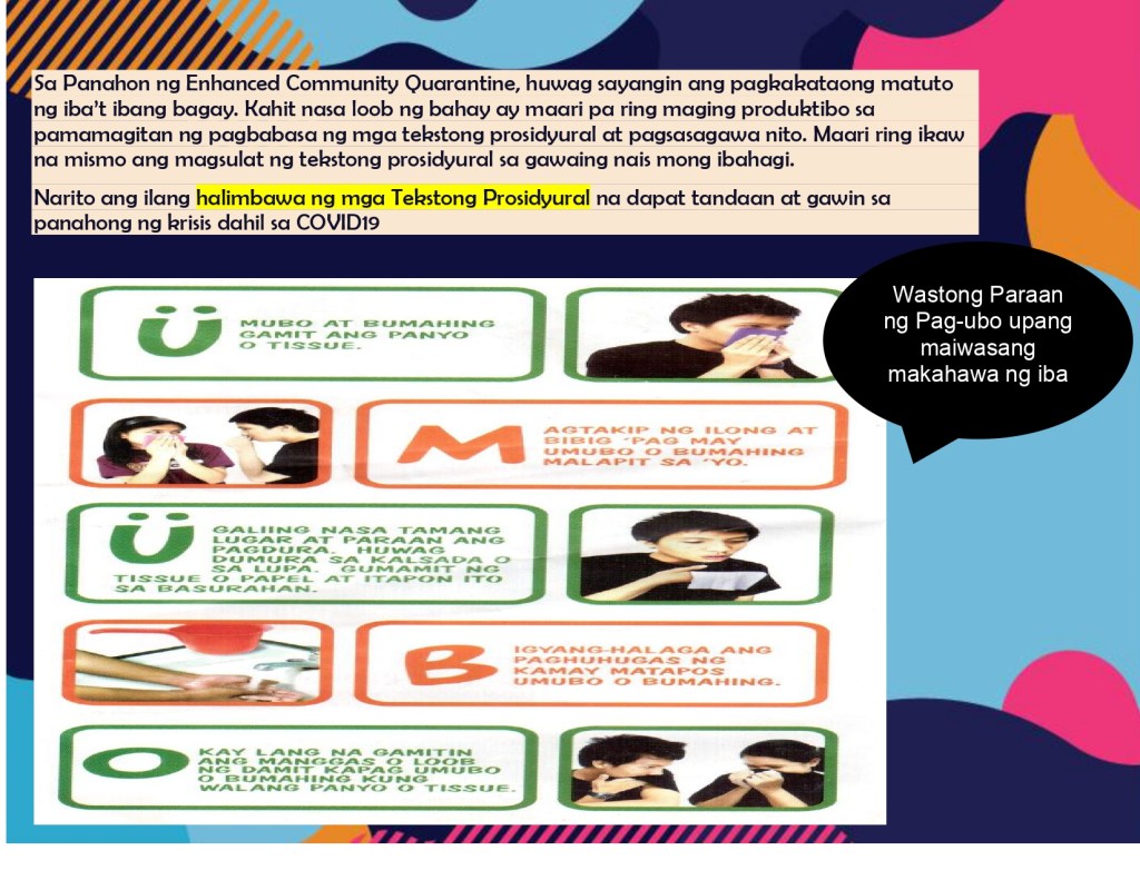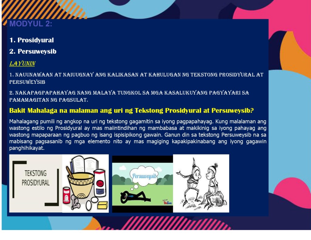 Pumili na lamang ng tatlong pahina sa nabuong kong modyul na may 21 pahina. Ang imprinta nito ay ginamit sa aking klase sa asignaturang Filipino sa pribadong paaralan sa Makati. Makikita na binigyan pansin ko ang uri ng aking mag-aaral na lahat ay nasa strand ng Sining kaya kailangan maging makulay ang modyul na imprenta o maari i-download ng aking mag-aaral sa website ng aming paaralan. Binigyang konsiderasyon ko rin ang kasalukuyang pangyayari kaya ikinonteksto ko ito sa karanasan nila sa pandemyang COVID19, malinaw ko ring inilahad sa unahan ang layunin ng aming aralin, binigyan highlight rin ang mahalagang salita at pinaikli ang mahahabang talakay, simple lamang ang ginamit na mga salitang madaling intindihin ng babasa at sa dulo bilang gawain dahil sila ay may malaking interes sa Sining ay pinagawa ko ng Digital poster kalakip ang layunin ng pag-aaral na panghihikayat sa pamamagitan ng pagbubuo ng Poster/Islogan na naka-angkla pa rin sa pagkakaisa sa gitna ng pandemya. May mga binigay na gawain na makahihimok sa mga mag-aaral na mag-isip at hindi rin nakalimutan na ilagay ang pinaghanguan ng kaalaman/detalye sa aking ginawang modyul.